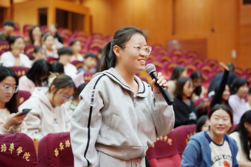 随后在观众互动环节中,主持人随机挑选幸运观众,提问有关党史校史的知识,回答正确即可获得小礼物。同学们热情高涨,积极参与,迅速准确地得出了答案,互动现场气氛活跃。