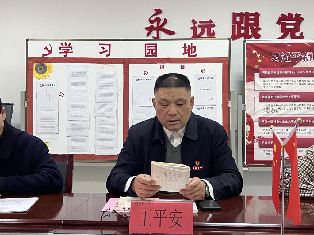 会议第一项,由学院党委书记王平安带领大家学习党的二十大报告。他指出,我们要原原本本、逐字逐句学习党的二十大报告和党章,学习习近平总书记在大会上的系列重要讲话和相关文件,在此基础上,同学习省第十四次党代会精神结合起来,联系教育工作的实际,做到学深悟透,深刻领悟“两个确立”的决定性意义,增强“四个意识”、坚定“四个自信”、做到“两个维护”,结合学院的教育教学,师资队伍建设、产学研建设、人才培养、学生管理等方面,助力学校的本科审核评建设。
