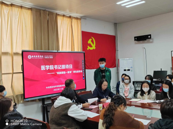 我国是一个由56个民族组成的大家庭,做好民族工作,是关系民族团结、国家长治久安和中华民族繁荣昌盛的大事。为进一步加强培育和践行社会主义核心价值观,大力弘扬爱国主义精神,不断加强民族团结进步教育,紧紧铸牢中华民族共同体意识,加强各民族交往交流交融,进一步促进我院各族学生团结友爱、勤奋互助、自强不息、立志成才,我院于2022年11月3日中午在党员活动室召开书记接待日暨“民族团结一家亲,同心共筑中国梦”师生座谈会。医学院党委书记兼行政副院长王平安、党委副书记何丽、党务兼行政干事万方芳、党务干事李萌、学生干事冯莹、新生辅导员老师代表、医学院各专业新入职教工代表及来自全国各地的22届33名各民族新生代表共计40余人参加了此次会议。