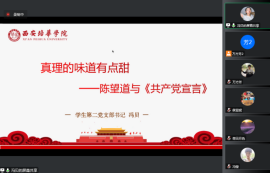 教工第一党支部书记别蓓蓓老师带领大家回顾了十九大报告的精神;教工第二党支部副书记侯亚妮老师通过一个个鲜活精彩的故事,表达了教学一线的教工党员在喜迎二十大,奋进新征程,建功新时代的信心和决心;学生第一党支部书记冯莹老师讲述了疫情防控中学院师生的感人事迹,号召广大党员共同参加到疫情防控中,全力支持配合疫情防控工作;学生第二党支部书记冯贝老师通过生动的视频教学引入,带领大家追溯的共产党宣言的诞生历程,追根溯源,回望致敬;学生第三党支部书记王佳老师以“喜迎二十大,奋进新征程”为主题,对二十大的基本情况进行了讲述;学生第四党支部书记包春萍老师以党员理想信念为题,对党员应该如何坚定理想信念做了详细的阐述;学生第五党支部书记冯娜老师、学生第六党支部书记刘桂萍老师以弘扬延安精神,传承红色文化为主题,深刻的展示了延安精神的重大历史和现实意义。精彩的党课让听众们深受感染与教育,备受鼓舞与力量。