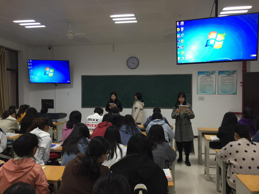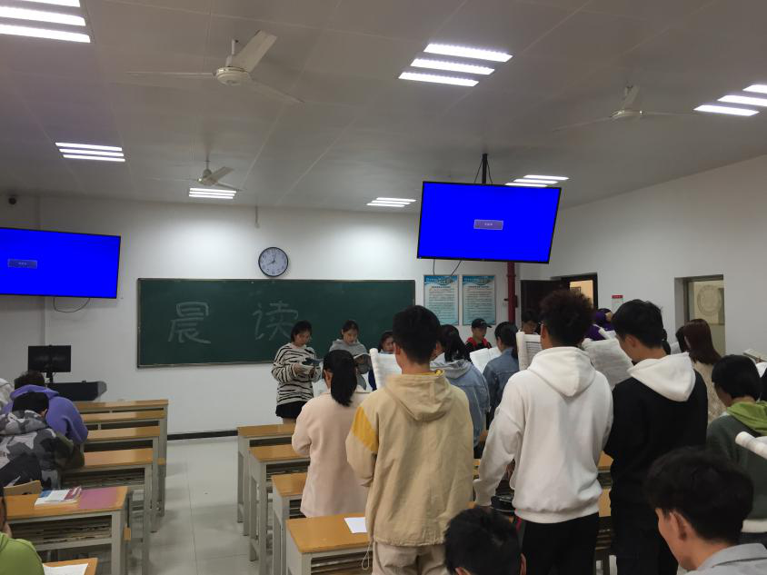 辅导员和班级班干部带领班级学生在上课前晨读