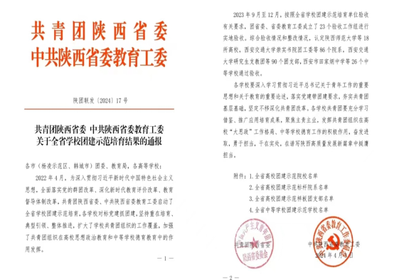 近日,共青团陕西省委、中共陕西省委教育工委联合下发《关于全省学校团建示范培育结果的通报》,我院团委获批“全省高校团建标杆院系”。