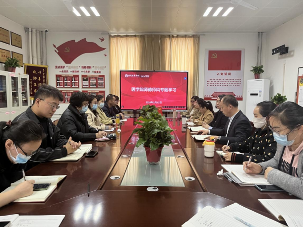 2024年3月13日,医学院在至善楼8330党员活动室召开师德师风系列专题学习会,参加会议的有医学院党委书记兼行政副院长史立军、党委副书记何丽和学生一站式服务站全体辅导员老师,会议由党委副书记兼服务站站长何丽主持。