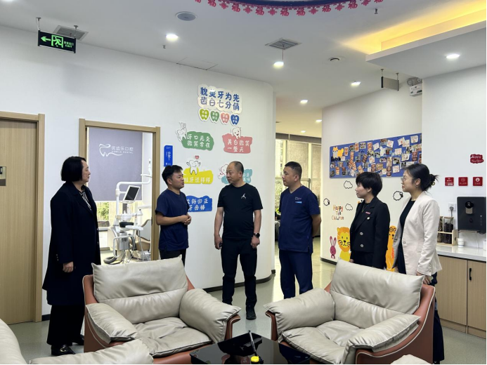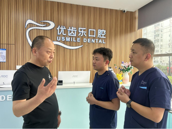 在活动中,医学院的老师们与西安长安优齿乐口腔门诊部店长周向朋、西安长安优齿乐口腔门诊部市场经理惠星渊,进行了深入的交流和互动。通过听取介绍、参观医疗设施、观摩医生诊疗过程等方式,全面了解了口腔医疗机构的运营模式、医疗技术和人才培养方案等。