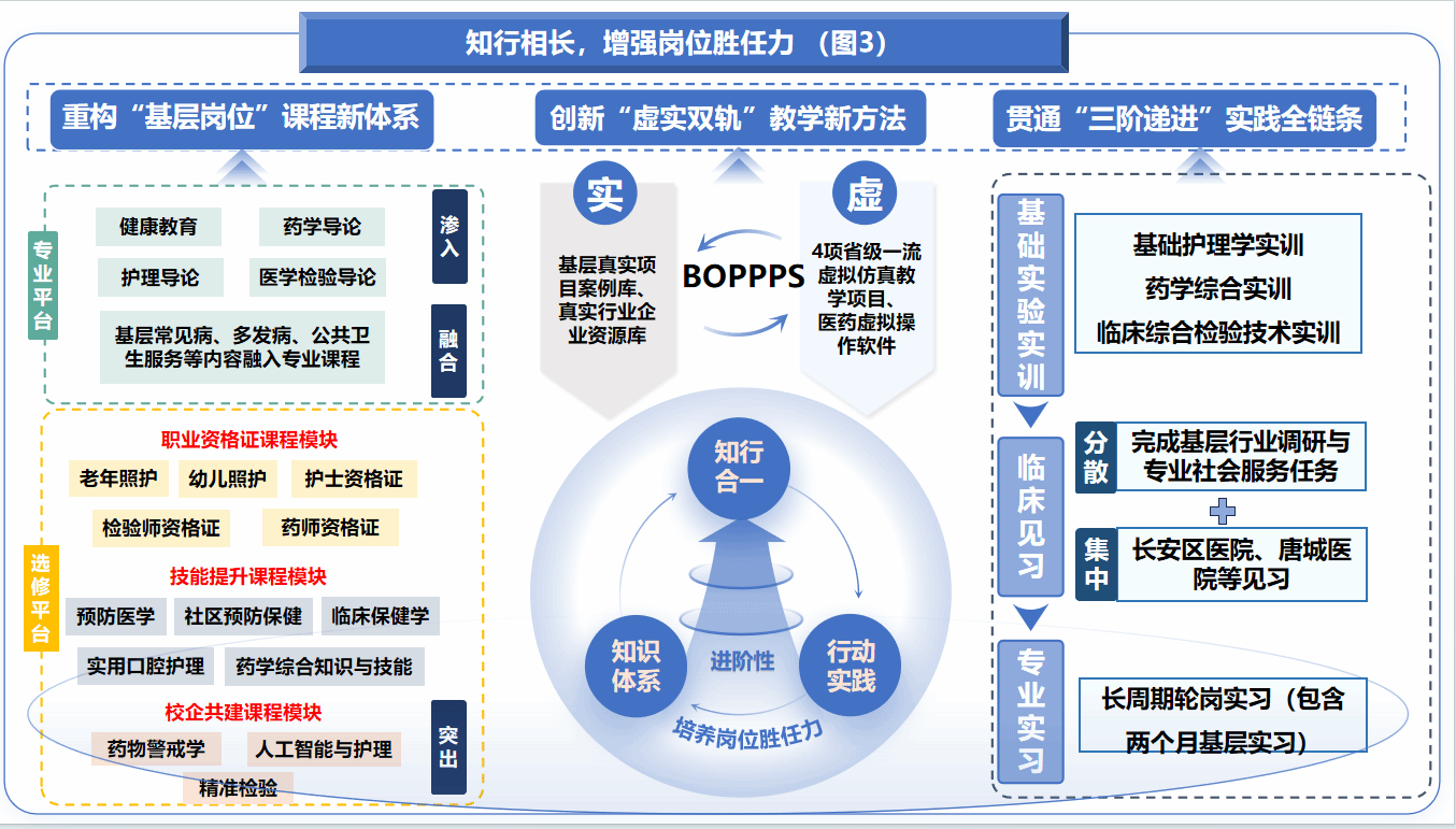 通过思政铸魂固本,筑牢学生扎根基层职业根基;知行相长赋能,全面提升基层一线岗位胜任能力;四方协同聚力,系统强化学生综合应用实践能力,形成思政铸魂育人新路径、知行相长人才培养新模式、校-院-企-社四方协同育人新机制等一系列标志性改革实践成果。