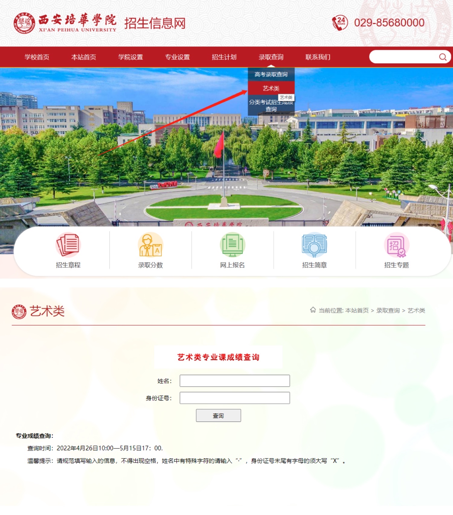 2.登录西安培华学院招生信息网:(http://www.peihua.edu.cn/zhaosheng/index.htm)→录取查询→艺术类,输入姓名、完整18位身份证号查询成绩。
