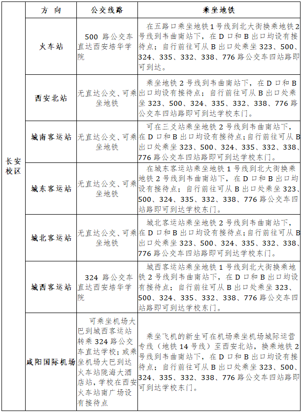 注:到达西安北站的新生,会有专人引导乘坐地铁,学校在地铁二号线终点韦曲南站(D口或B口)接站。