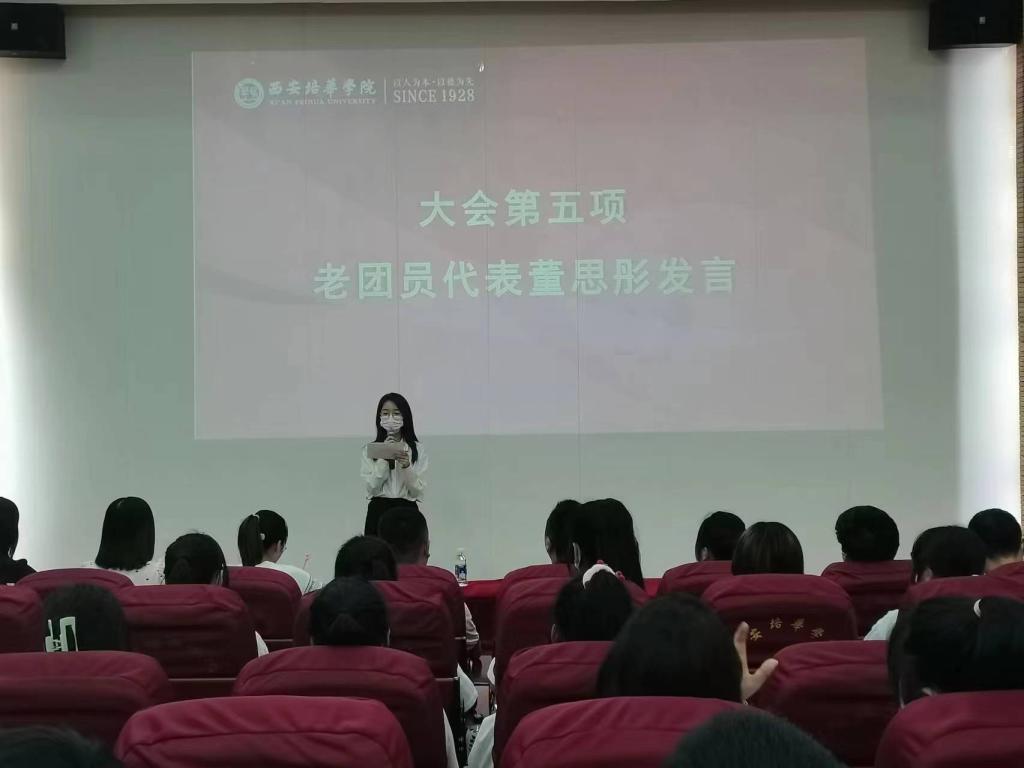 老团员代表董思彤同学上台发言,她说道:欢迎新团员加入共青团这个热血青春的大集体,为团学组织注入了新鲜的血液和活力,我们一定会为新团员做好榜样引领作用,把自己的个人发展同祖国的发展紧密关联,继承和发扬中华优秀传统文化和革命精神,为实现祖国的繁荣富强不断努力奋斗。