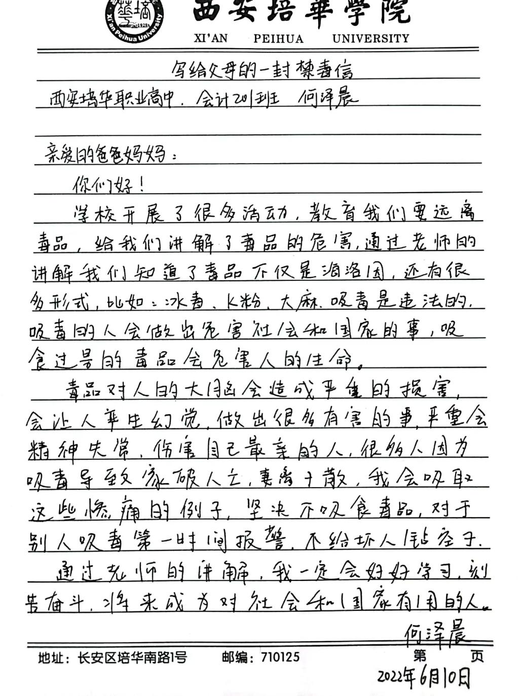 为了引导家长重视禁毒工作,我校组织开展了“写给父母的一封禁毒信”活动,组织学生把自己对于毒品的危害和拒绝毒品的决心写成信件交给父母,形成禁毒防护的有效闭环,确保此次禁毒专题活动的效果落实到位。