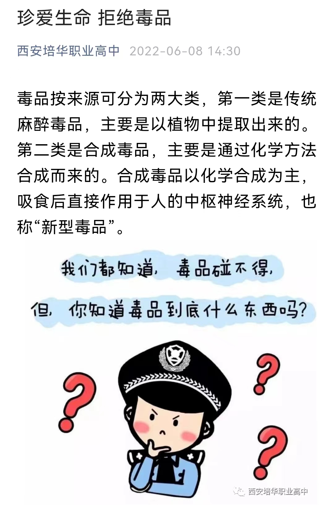 为认真贯彻落实习近平总书记关于禁毒工作的重要指示精神,广泛传播健康人生、绿色无毒理念,大力营造广大师生重视支持、积极参与禁毒工作的浓厚氛围,我校按照《关于印发长安区教育系统 2022禁毒宣传月系列活动实施方案的通知》文件要求开展了禁毒月主题教育活动。