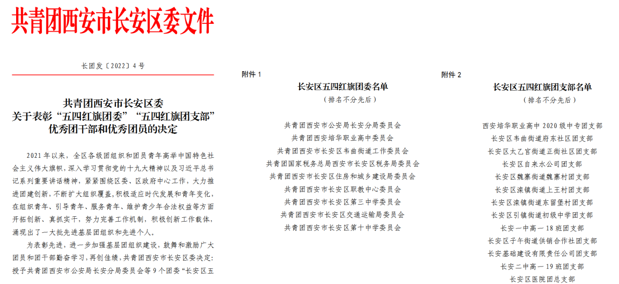 根据共青团西安市长安区委《关于表彰“五四红旗团委”“五四红旗团支部”优秀团干部和优秀团员的决定》(长团发〔2022〕4号)文件,我校团委荣获“长安区五四红旗团委”荣誉称号,2020级中专团支部获得“五四红旗团支部”荣誉称号。