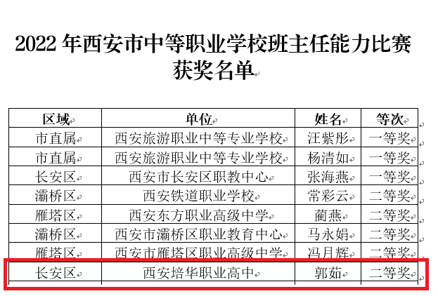 2022年11月18日,西安市教育局公布了2022年西安市中等职业学校班主任能力比赛获奖名单,我校郭茹老师荣获2022年西安市中等职业学校班主任能力比赛二等奖。