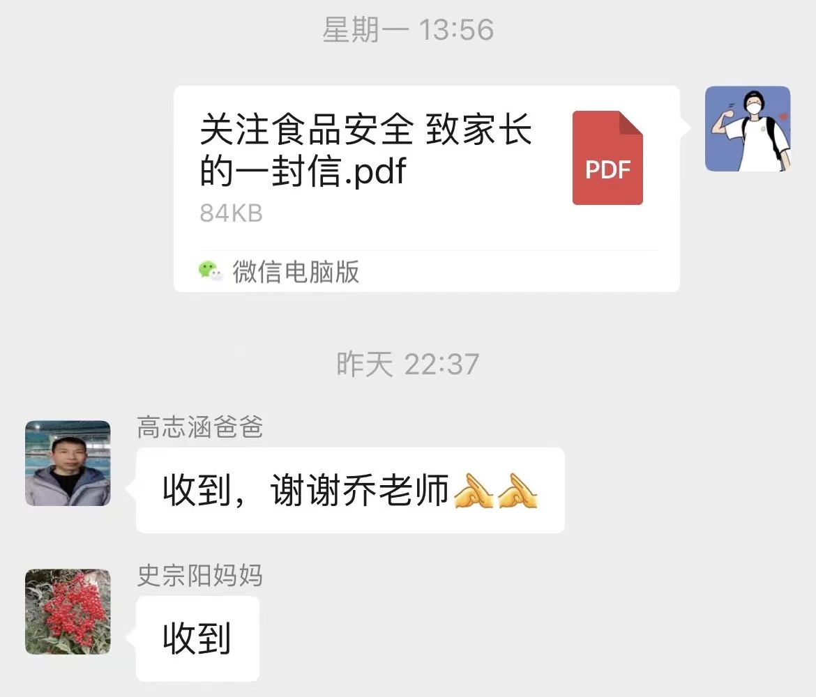 学校结合食品安全相关要求撰写《致家长的一封信》,通过班主任发送至家长群,希望家校紧密配合关注食品安全和学生健康,不仅让学生在学校吃的安全,也让学生在家里吃的放心,共同为学生的健康成长保驾护航。