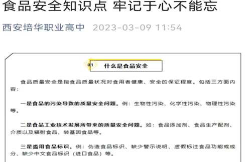 为提升师生食品安全意识,筑牢校园安全防线,切实保障师生饮食安全,根据长安区教育局《关于开展2023年食品安全宣传月活动的通知》要求,我校开展了一系列食品安全主题活动。