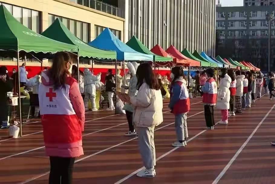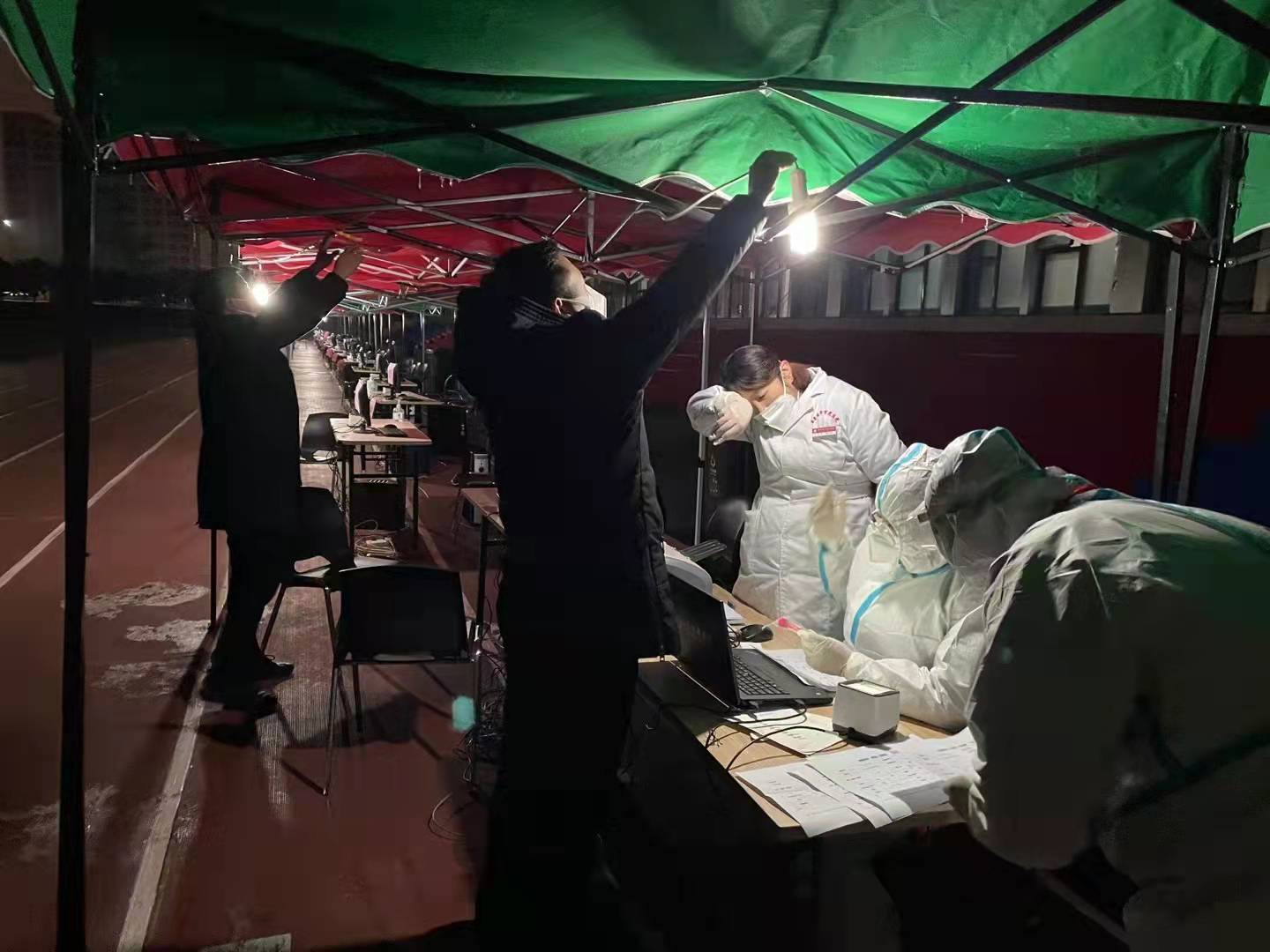 学生志愿者们也坚持奋战在抗击疫情的第一线,在凌晨的寒风中搭建核酸需要使用的帐篷,协助老师组织学生有序进行核酸检测,对浴室进行通风和消毒等等,虽然平时的他们略显稚嫩,但此刻身穿志愿者工作服的他们却坚定而沉着,彰显了青年学子的使命和担当。