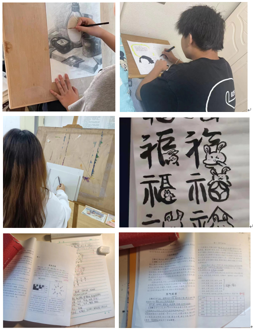 我校鼓励学生认真做好假期学业规划,利用假期时间充实自己,有的同学利用闲暇时间练习书法,有的同学拿起画笔进行素描创作,有的同学认真学习理论知识,通过各种途径提高自己。
