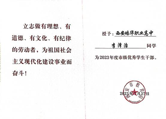 在2023年度西安市“三好学生”“优秀班干部”和“先进班集体”的评选活动中,我校叶向东、李泽治、王颖同学荣获西安市“三好学生”称号,艺术设计与制作211班荣获西安市“先进班集体”称号。