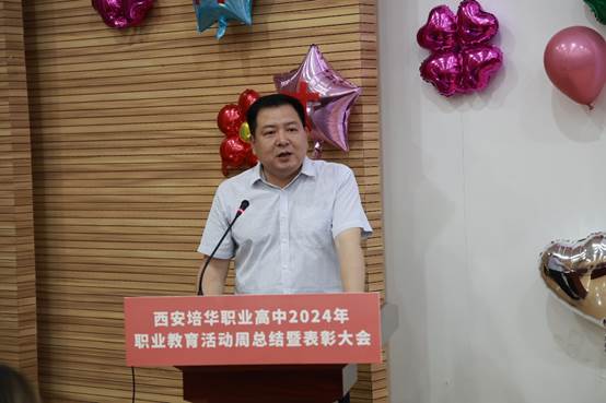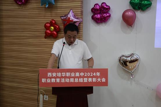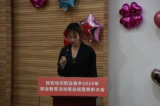 教研室副主任李静安老师宣读了《西安培华职业高中关于2023-2024学年第二学期期中考试学习成绩优异学生表彰的决定》、《西安培华职业高中2024年校园文化艺术节优秀学生的表彰决定》及《西安培华职业高中关于2024年职业教育活动周优秀学生的表彰决定》。