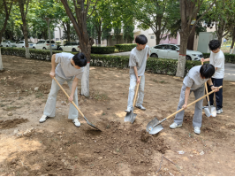 学生们在班主任的带领下开始劳动,同学们分工合作、配合默契,播种、耙地、浇水,尽管动作和手法还不是很熟练,但阻挡不了同学们劳动的热情。