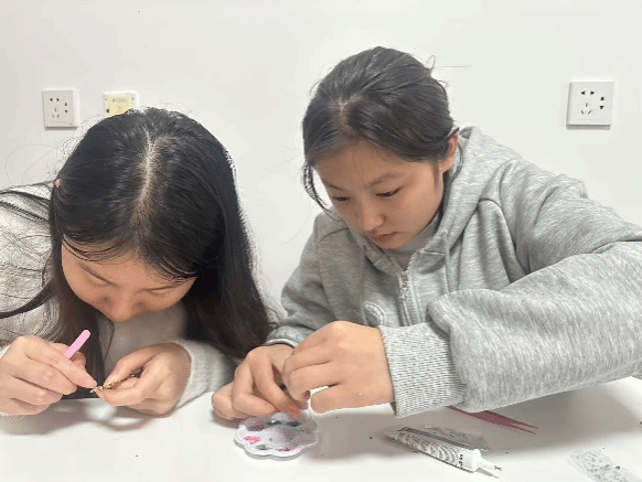 同学们在老师指导下开启“创作之旅”,从打磨木梳基底的耐心细致,到挑选螺钿薄片的精挑细选,再到用胶水固定、用砂纸打磨的步步用心,每一个步骤都充满挑战与乐趣。同学们充分发挥自己的创意,将一片片螺钿精心排列组合,原本朴素的饰品基底在他们手中逐渐焕发出绚丽光彩。
