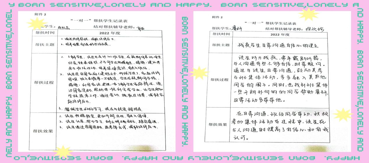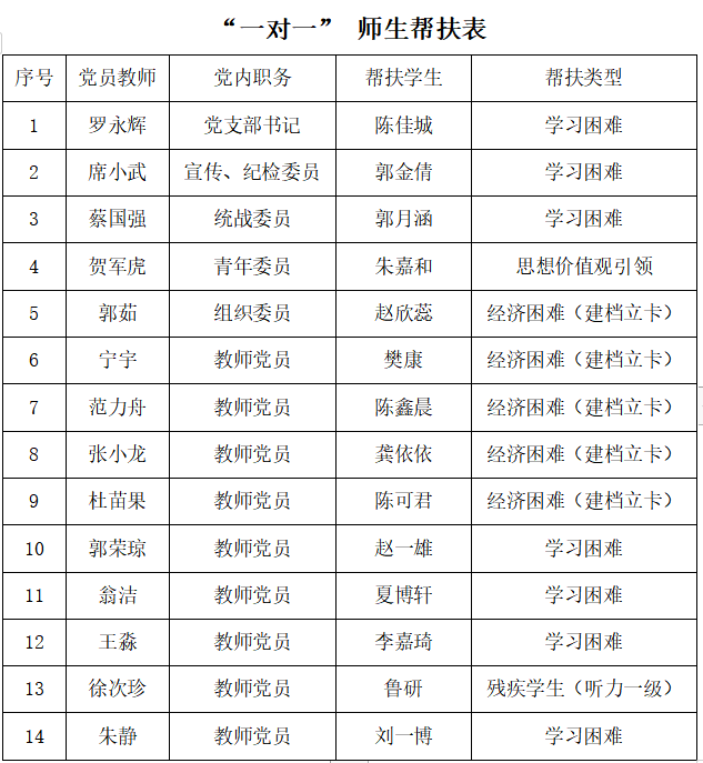 更进一步的落实“一对一”结对帮扶效果,了解所帮扶学生的学习和生活情况以及思想状况,党支部在开展结对帮扶工作中,坚持求真务实、开拓创新的原则,精心组织,周密安排结对帮扶工作,取得显著成效。通过“一对一”结对帮扶活动,各位教师党员深入了解帮扶对象在学习和生活中的实际困难,深入做好帮扶学生的思想教育和交心工作,对受帮扶同学从思想,学习、生活等方面进行全方位的帮扶,让学生感受到学校大家庭的温暖。