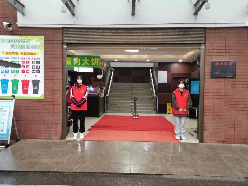 我校组织成立志愿者队伍分别在公寓和餐厅值班,提醒同学注意防护带好口罩,进入食堂后有序排队间隔一米,将饭菜打包带走不能堂食,切实发扬志愿服务精神,为校园疫情防控贡献青春力量。