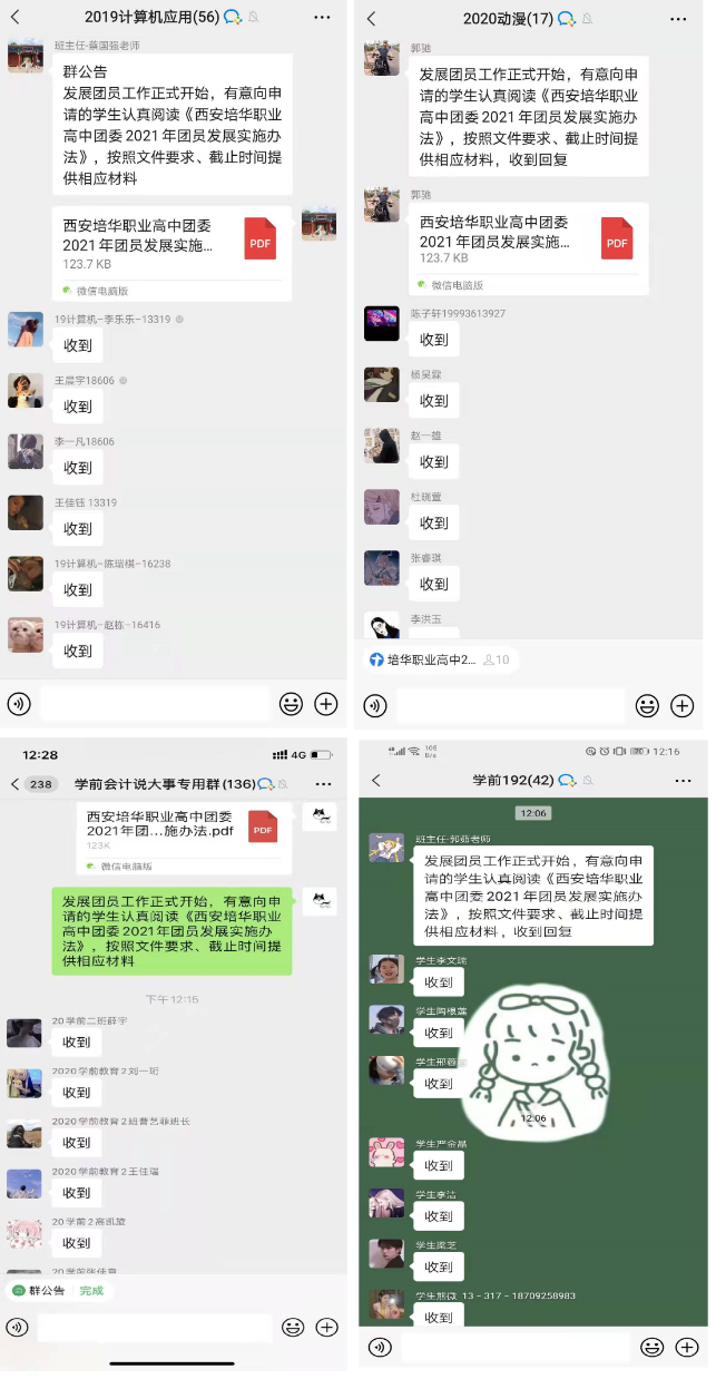 我校组织班主任对文件进行认真研讨和学习,确保老师对团员发展工作各项内容都了解熟悉,并通过班级微信群的方式将发展团员文件发至所有学生,保证入团工作的相关内容和发展办法传达到每位同学。