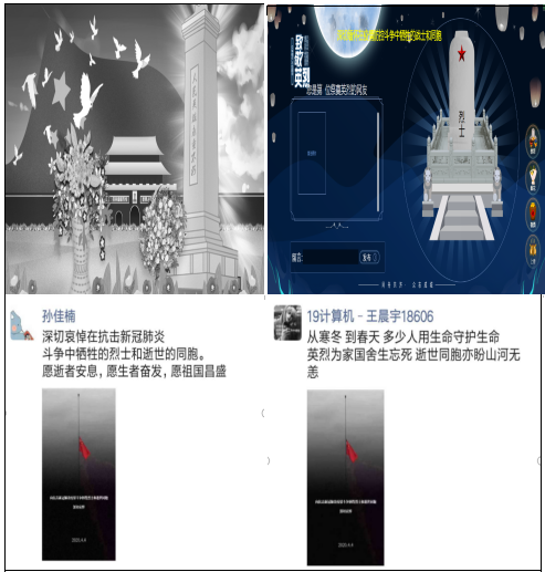 虽然因为疫情原因只能呆在家中,但这并不能阻碍师生用自己的方式表达对烈士的崇敬和哀悼。学生和老师通过在朋友圈发布悼文和图片致敬烈士、缅怀同胞;我校团委组织团学青年登录英烈网站在线学习先烈英雄事迹,在纪念碑前献上花束,在英烈纪念馆进行留言,通过这种方式缅怀先烈先贤,加强学生爱国主义教育,弘扬和传承中华民族伟大精神。