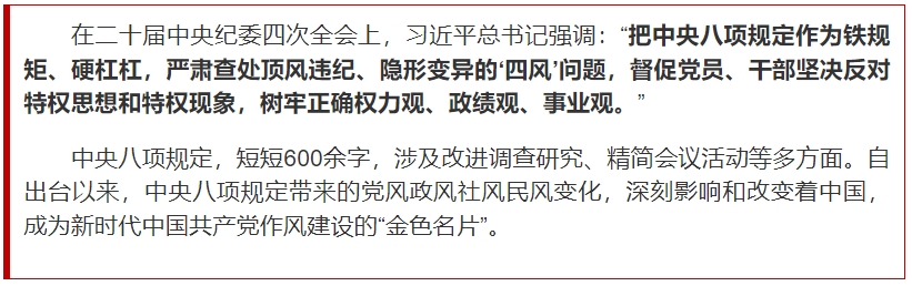 2012年12月,中共中央政治局作出关于改进工作作风、密切联系群众的八项规定: