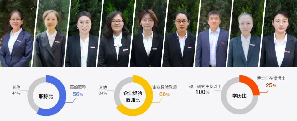 本专业拥有一支教学能力强、科研水平高、实战经验丰富的师资队伍。硕士研究生及以上学历达100%,博士与在读博士占比25%,高级职称占比56%,企业一线研发背景教师占比66%。教师团队将行业前沿技术(如鸿蒙系统开发、AI数据分析等)深度融入课堂教学,结合真实项目案例教学,让学生在校园内即可接触企业级开发全流程,真正实现“课堂即职场”的培养目标。
