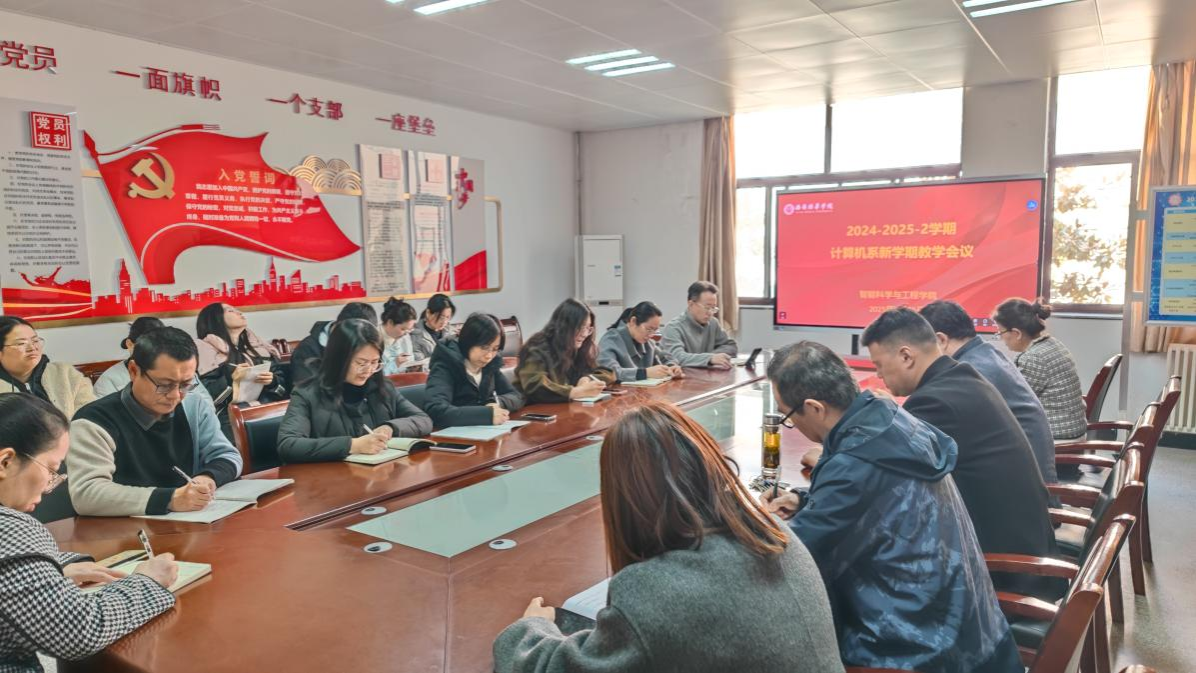 2025年2月25日,计算机系在学院会议室召开新学期教学工作会议,全面规划新学期教学工作,计算机专业全体教师参与,焦纯主任主持会议。