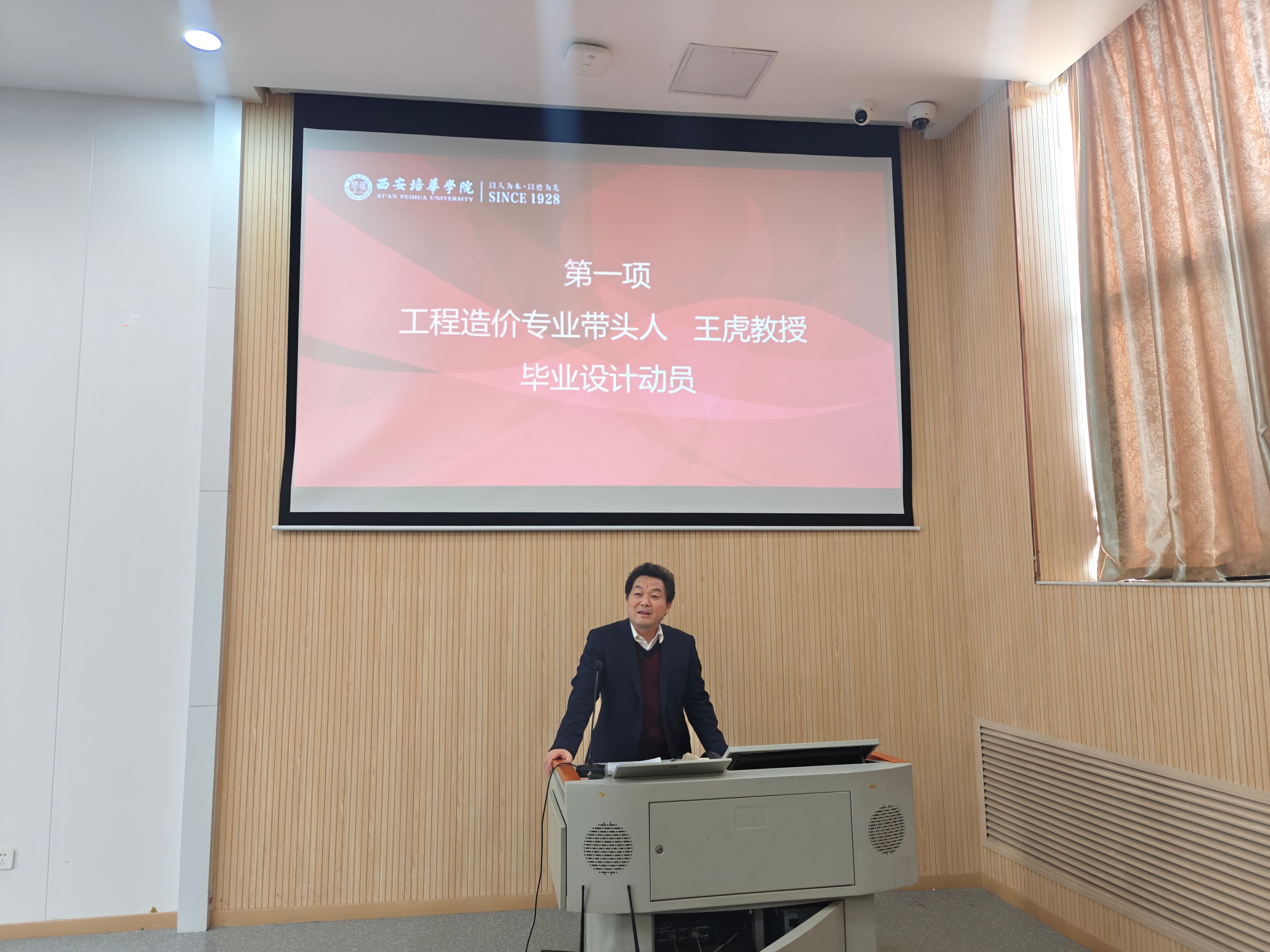 工程造价专业带头人王虎教授发表了重要讲话,强调了毕业设计作为高等教育重要组成部分的深远意义,以及它对学生个人成长和未来发展的重要性,并阐述了毕业设计的基本要求,包括选题原则、格式规范、时间节点和答辩流程等。他特别指出,毕业设计不仅是对学生专业知识的综合运用,更是对其创新能力、团队协作能力和解决问题能力的一次全面检验。