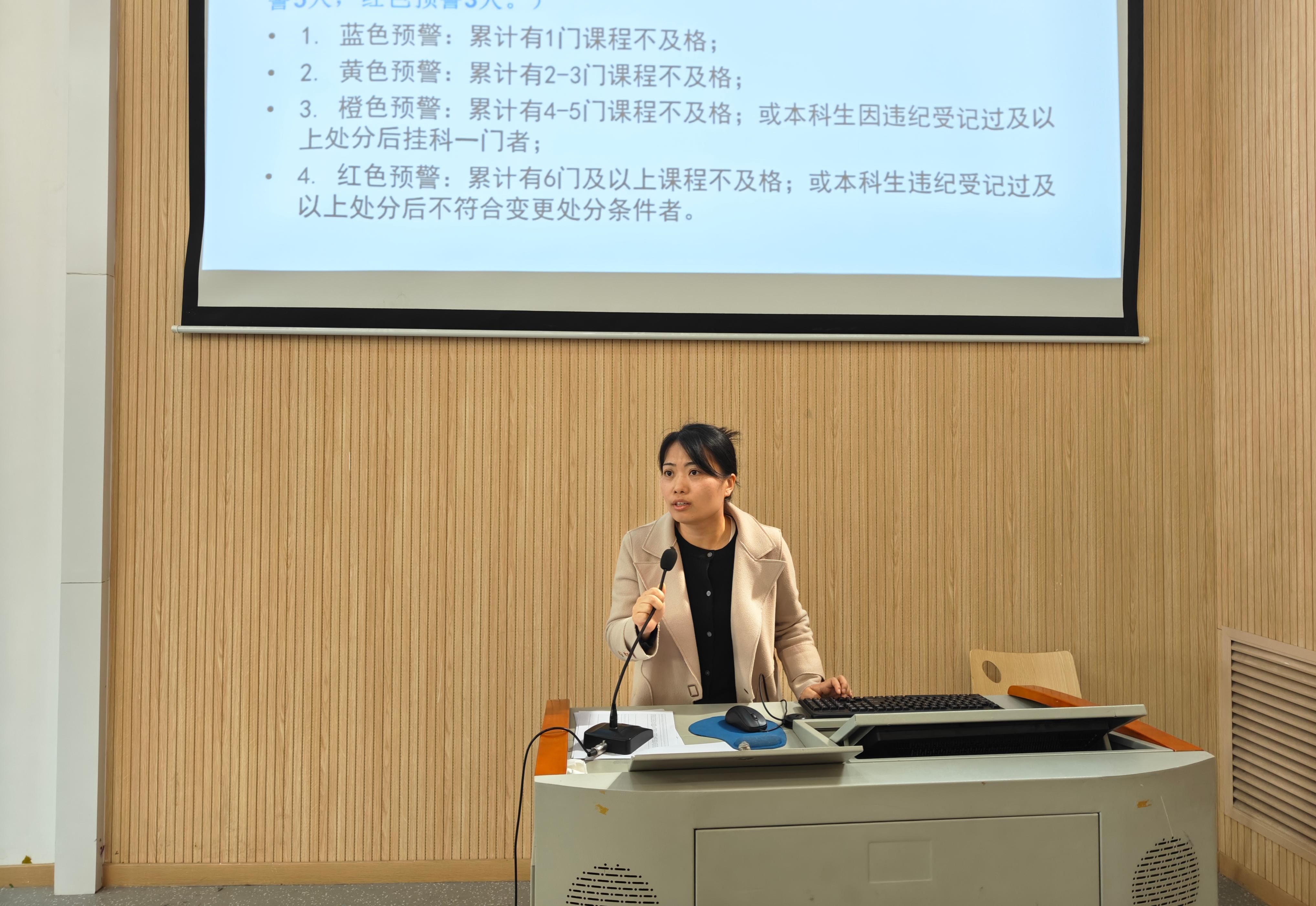 教学科研干事杨燕随后对学业警示工作的内容及流程进行了详细解读,强调了各年级本科、专科在毕业前需要完成的公选课要求,以及学业情况对学士学位资格的影响。她指出学业导师应针对学生的学业情况制定相应的帮扶方案及指导措施,对学生实行学业跟踪,及时给予指导及帮扶,确保学生顺利完成学业。