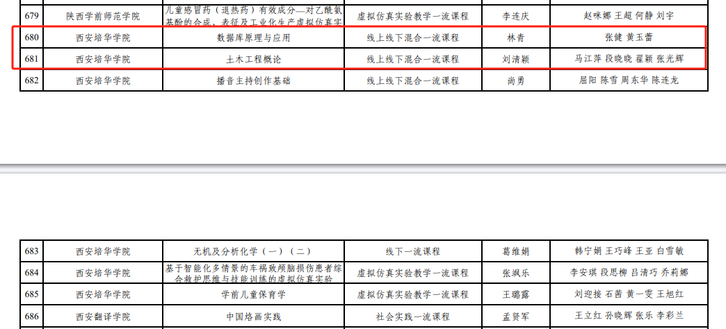 近日,陕西省教育厅发布《陕西省教育厅关于公布第三批省级一流本科课程认定结果的通知》(陕教函[2024]243号),我校共获批6门省级一流课程,其中我院获批2门省级一流课程,林青教授主持的《数据库原理与应用》入选线上线下一流课程,刘清颖副教授主持的《土木工程概论》入选线上线下一流课程。
