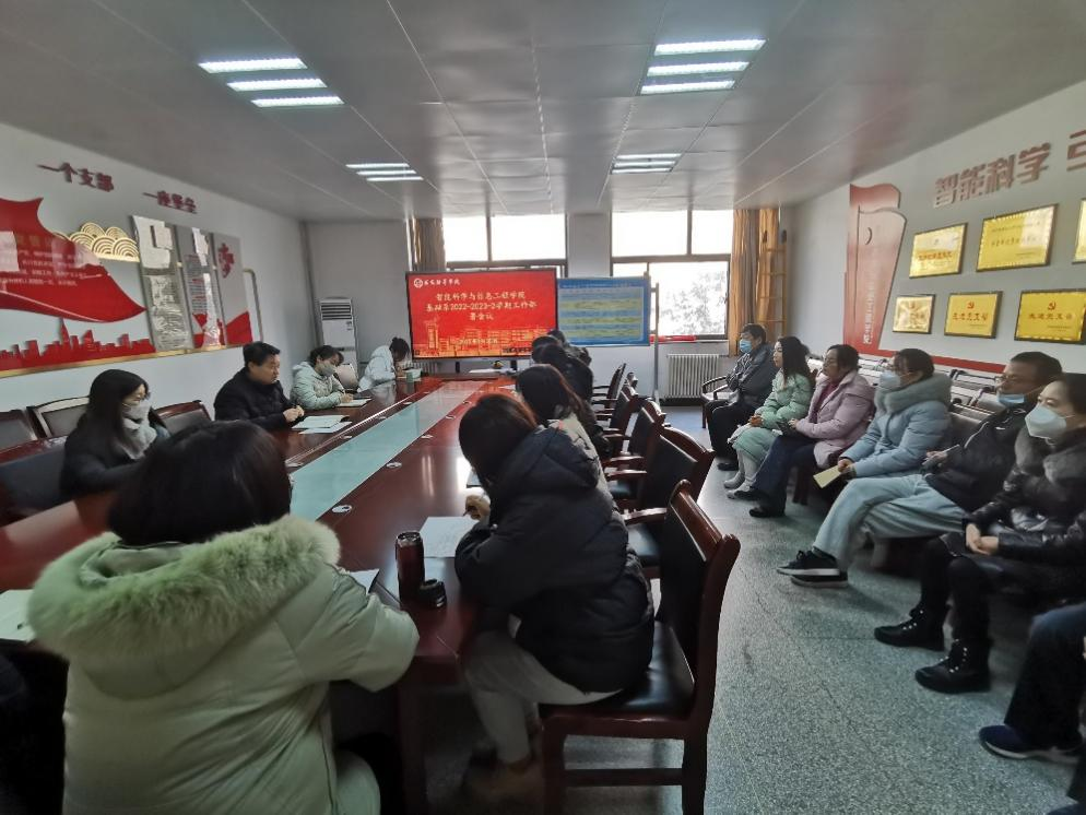 1月30日下午,基础系在学院会议室召开了新学期工作会议,总结了上学年重点工作推进情况,安排部署了下学年重点任务。会议要求在新的学期,全系要按照学校、学院关于下半年审核评估工作要求为总目标思想为指导,深入贯彻落实审核评估的各项准备工作,踔厉奋发、勇毅前进,加快推动各项重点工作落地见效。全体教师参加会议,基础系主任陈文利讲话。