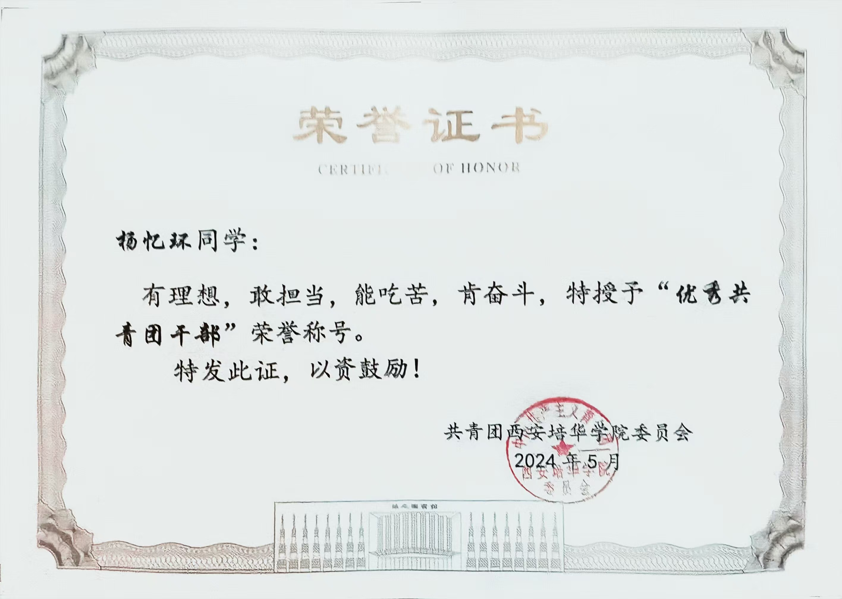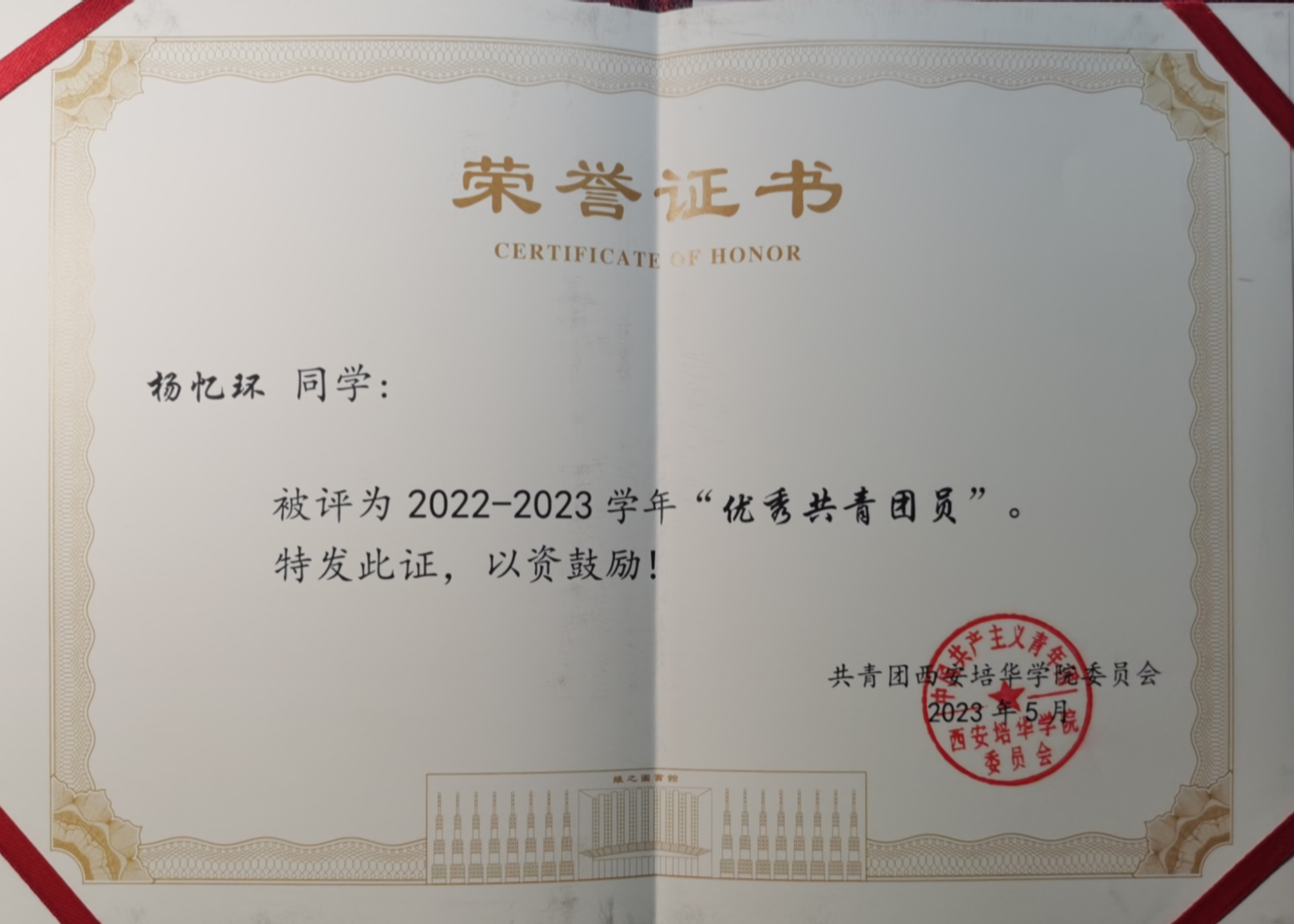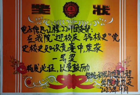 自加入共青团以来,杨忆环同志始终怀揣对党的深厚情感和追求进步的坚定决心,积极主动地学习党的理论知识,提升政治觉悟,并致力于将理论知识与实践相结合。在成为中共党员之后,杨忆环同志更加深刻地认识到提升政治理论水平的重要性,积极投身于党组织的各项活动,深入学习习近平新时代中国特色社会主义思想以及党的光辉历史和章程,努力在工作和生活中贯彻党的宗旨,为中华民族的伟大复兴贡献自己的力量。杨忆环同志荣获校级第三届党史校史知识竞赛决赛二等奖,并在2022-2023学年被评为“优秀共青团员”。