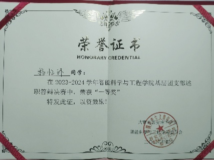 作为班级团支书,杨忆环同志致力于团组织工作的完善,成功组织了多次团日活动,有效提升了班级的凝聚力和团员的责任感,并高质量地完成了班级“推优入党”任务。在每次团日活动中,杨忆环同志都会引导同学们共同学习党史、团史,并鼓励大家分享学习心得。通过积极的互动和热烈的讨论,加深了同学们对团组织的理解。在2023-2024学年,她被评为“优秀共青团干部”,并连续两年在基层团支部述职决赛中荣获“一等奖”。此外,她的班级在2024年寒假大学生返家乡“五育并举”活动中被评为优秀组织班级,团支部也在“迎校庆 铭校史”党史校史知识竞赛中荣获一等奖。