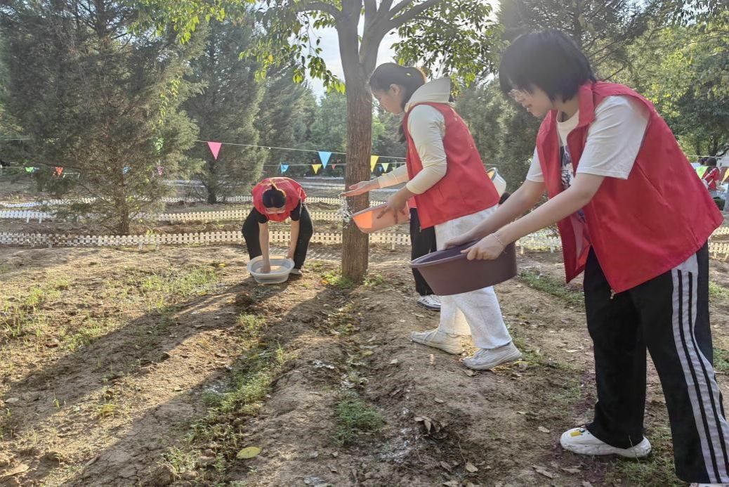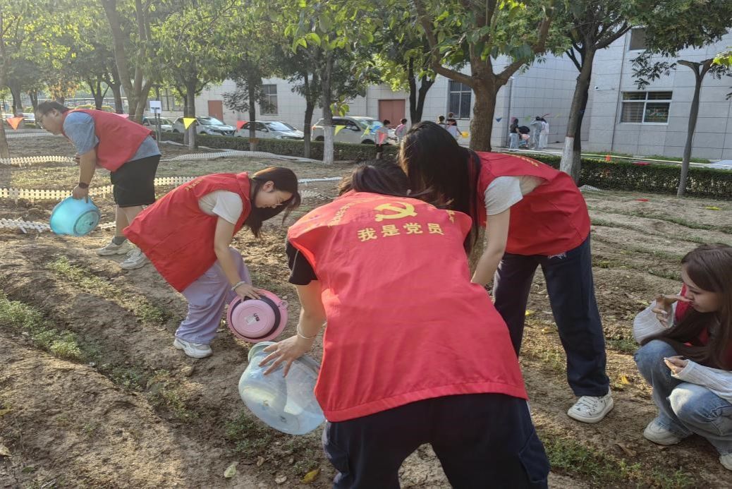 每日下午放学后,热心的党员、积极分子们穿着统一的志愿者服,纷纷手持水盆等工具在我院劳动教育基地现场分组、认领责任片区并用心浇灌播种区域。