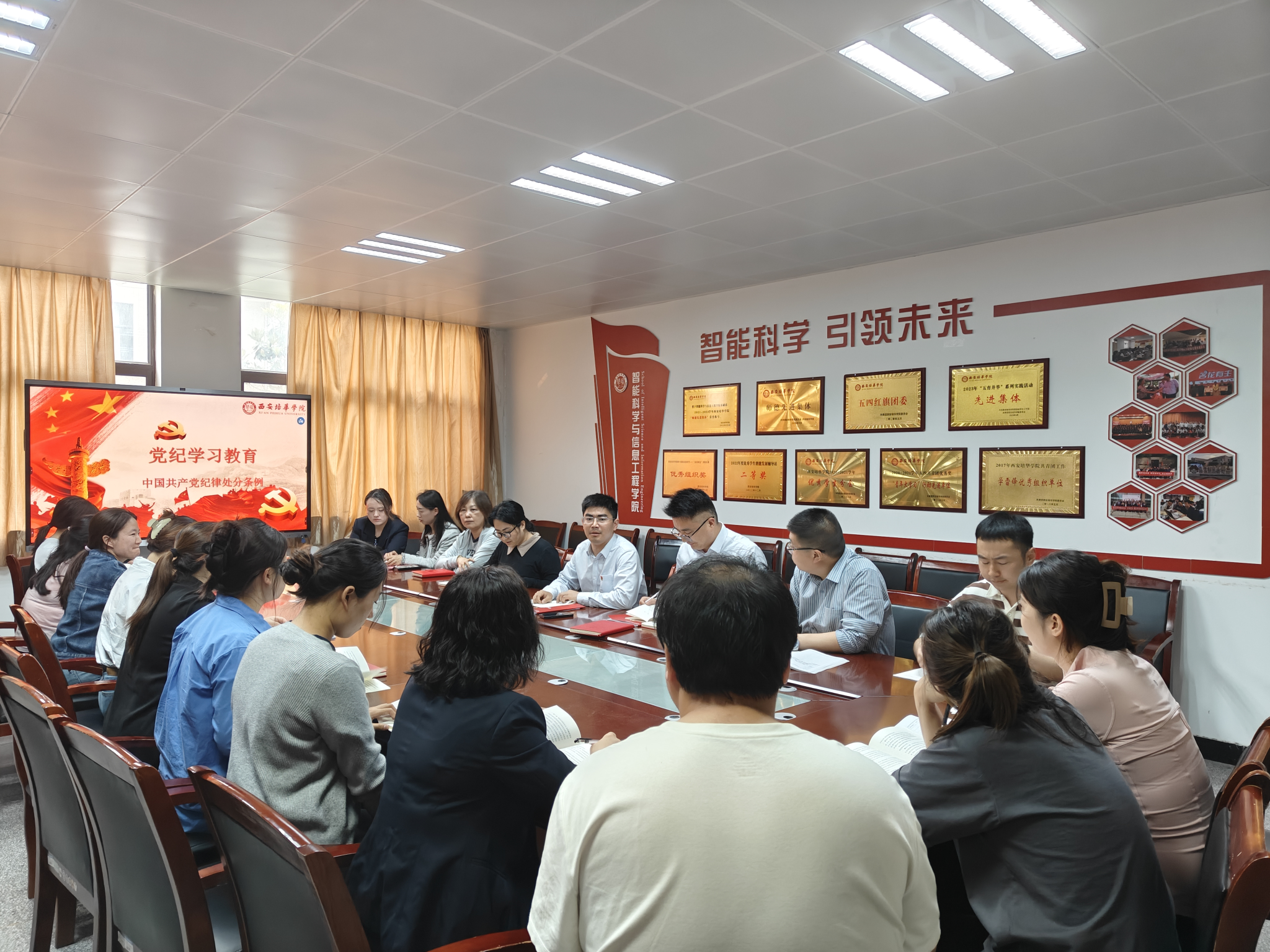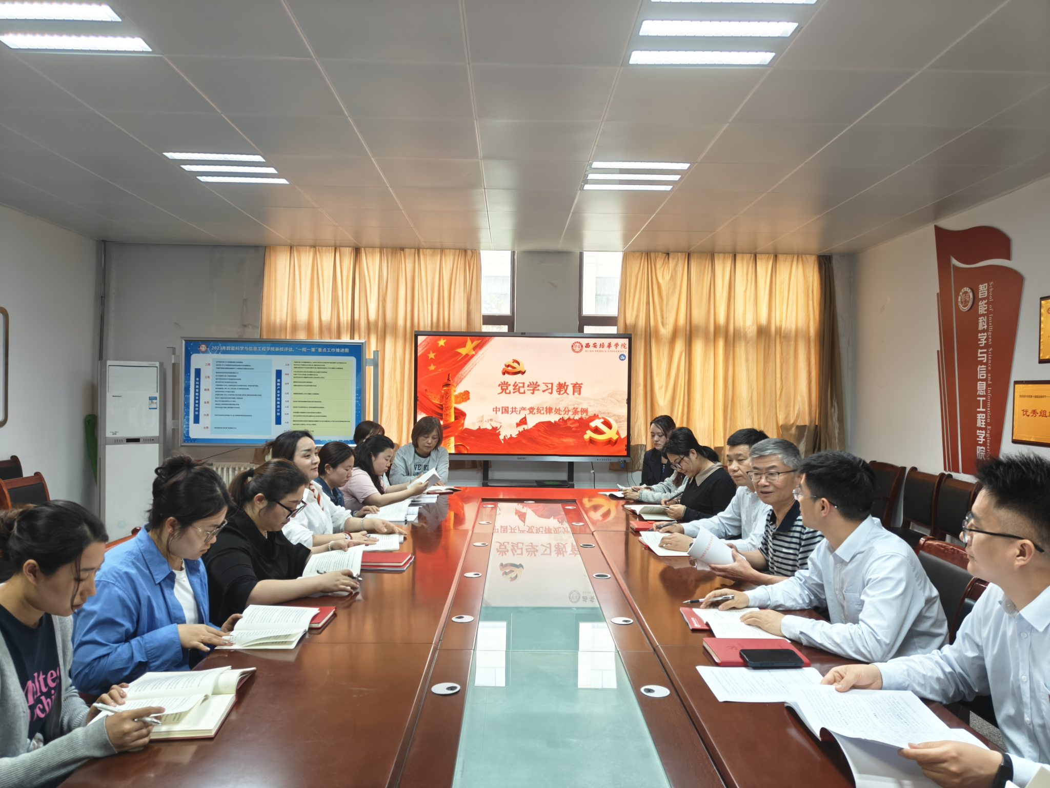 为深入学习贯彻习近平总书记关于党纪学习教育的重要讲话重要批示精神,认真学习贯彻《中国共产党纪律处分条例》,根据《中共西安培华学院委员会关于举办党纪学习教育读书班的通知》精神,5月8日下午,智能科学与工程学院党纪学习教育读书班开班。西安培华学院党委书记刘锋、党委宣传部部长蔡亮、智能科学与工程学院党委书记兼行政副院长王林、院长助理刘清颖、党委副书记王伟平、全体党支部书记及师生代表等共20余人参加学习。