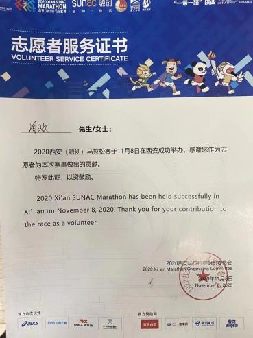 周欢同学经常活跃在各类志愿服务活动一线,他积极参加暑期“三下乡”、2020西安融创马拉松赛事志愿者、残奥会赛事志愿者等,坚持在修身养德中成为践行志愿服务精神的“排头兵”。