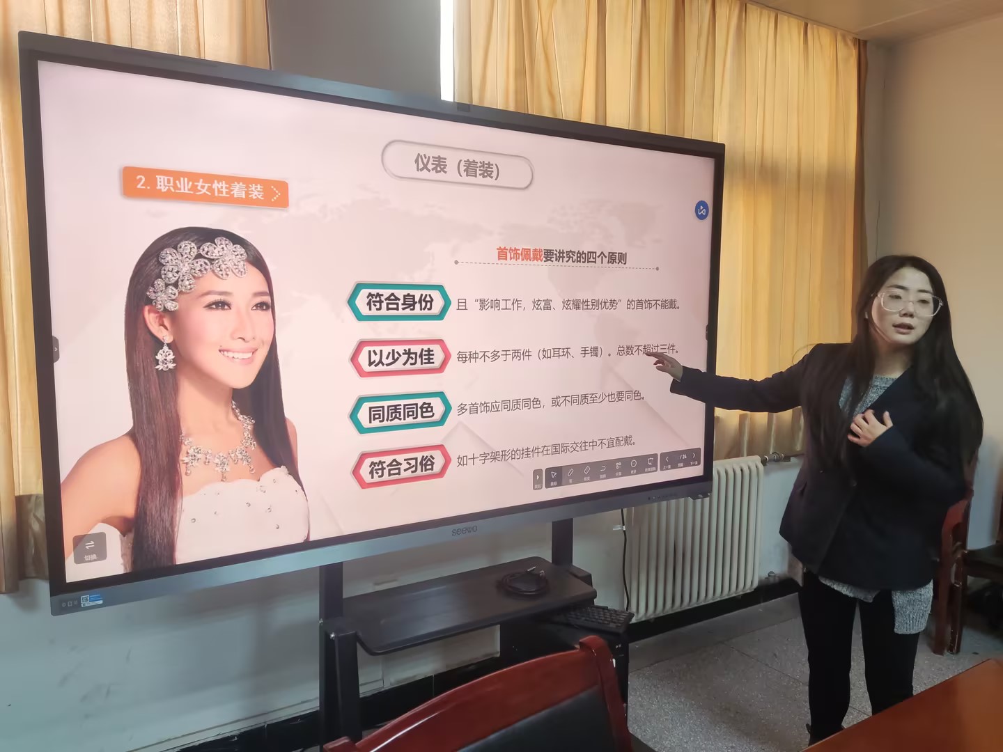 “学高为师,身正为范”,作为高校教师要不断提高自身的业务水平,更新观念,钻研业务,成为有良知、有新知、有真知的合格教师。身为女性教师如何加强自身的人格塑造,并通过职业的礼仪表现出应有的风度,在注重“简洁、端庄、文雅”的着装的同时,彰显符合教师的身份,是对新时代高校女教师提出的一个要求。我院工会分会忤怡欣于2023年12月19日在党员活动室针对女教职工开展了“穿出自我,展现职业风采”的女教职工职业形象礼仪培训活动,帮助女教职工提升礼仪修养,塑造教师美好形象。