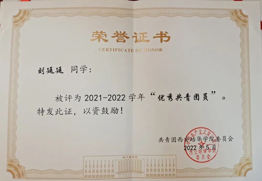 在学习上,她勤奋努力、踏实认真,学习成绩一直名列前茅,连续两年获得国家励志奖学金,荣获2021-2022学年自强之星奖学金,顺利通过大学英语四级考试并考取了CEAC商务办公专家(高级)证书,获评“三好学生”“优秀共青团员”等称号;同时积极参与各类竞赛,在中国大学生计算机设计大赛、高校微信小程序应用开发大赛、西安培华学院第三届中华诗词大赛均有获奖。
