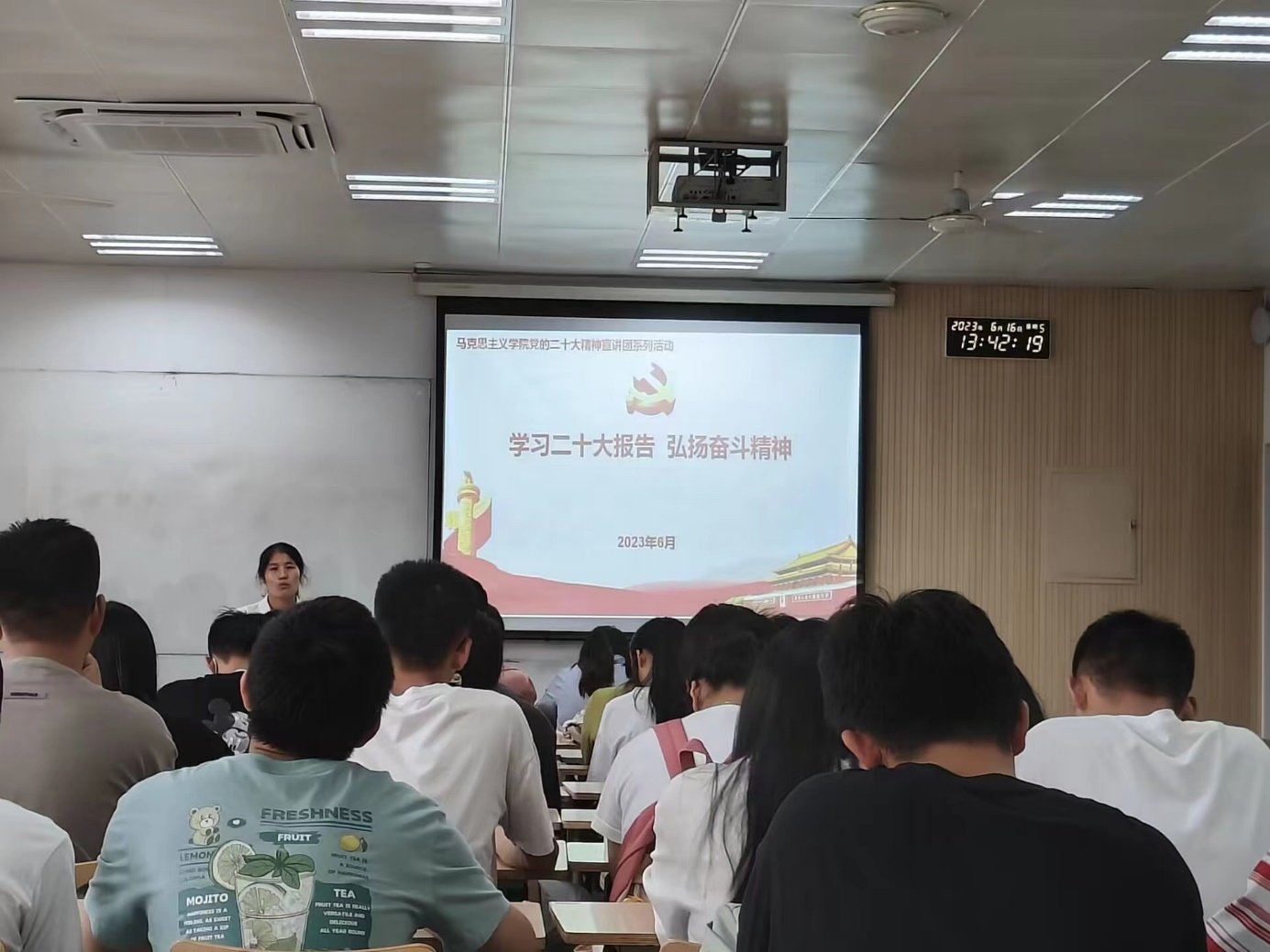 为深入学习宣传贯彻党的二十大精神,深刻领会党的二十大报告内容,我院学生第一党支部于2023年6月16日在育英楼3218教室召开“学习二十大报告 弘扬奋斗精神”专题党课,支部全体党员参加了此次党课学习。