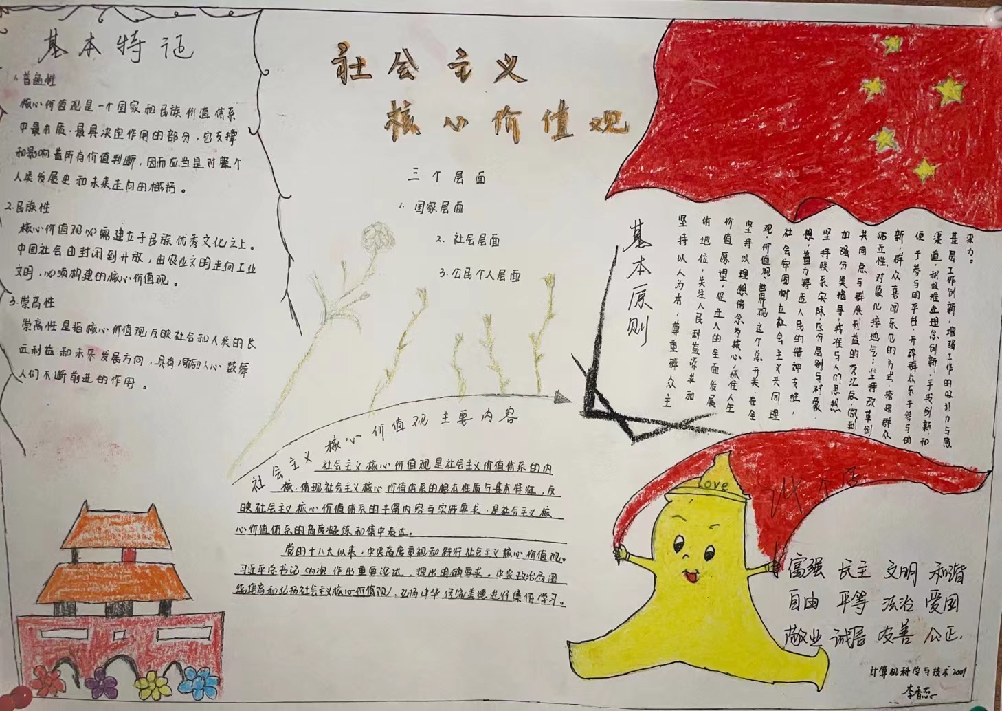 本次活动主要在本次发展对象中进行,围绕“社会主义核心价值观”主题开展手抄报、征文活动。作品内容丰富,紧扣主题,既突出了爱国主义情感,又彰显了学生的个人修养,在全面宣传社会主义核心价值观的基础上,也表达了同学们对待社会主义核心价值观积极的态度。同学们在写、画的过程中,更深刻地理解了社会主义核心价值观的丰富内涵和精神实质。
