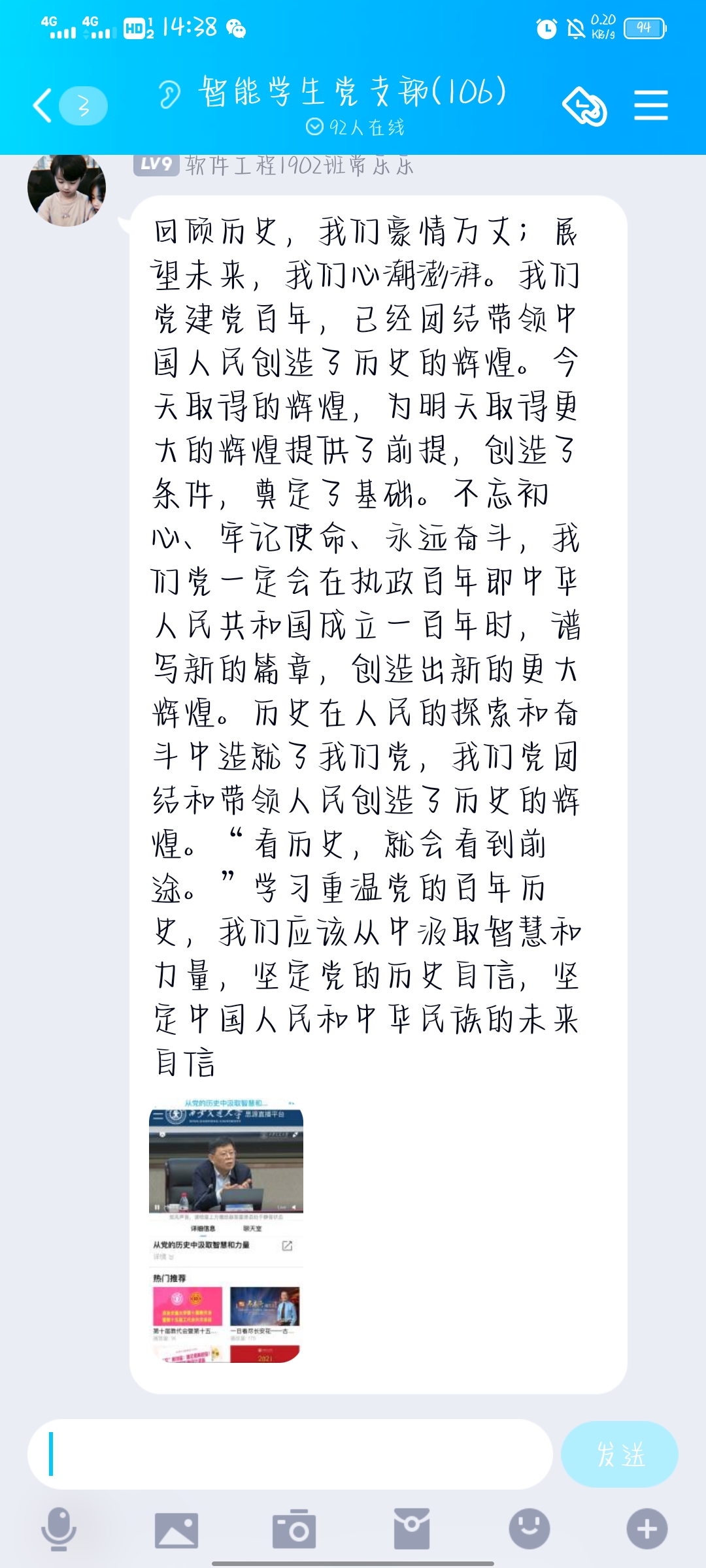 今年是中国共产党成立一百周年,为认真学习贯彻习近平总书记在党史学习教育动员大会上的重要讲话精神,深入推进党史学习教育,引导广大师生从党的百年非凡历程中感悟思想伟力、汲取奋进力量。省委教育工委委托陕西大学生形势政策教育信息中心邀请教育部高等学校社会科学发展研究中心主任、北京师范大学教授、博士生导师王炳林,于2021年4月1日(星期四)10.00-12:00为我省高校师生作《从党的历史中汲取智慧和力量》主题报告。智能科学与信息工程学院党总支组织师生党员通过线上观看报告会直播,并纷纷发表心得感悟。