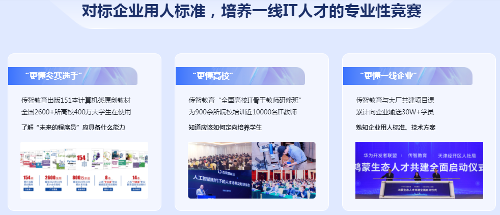 1.权威赛事:“传智杯”由权威教育机构主办,是教育部、高校广泛认可的权威性竞赛。承办方传智教育旗下的黑马程序员以高品质的职业教育,赢得业界口碑。该比赛是对标企业用人标准,培养一线IT人才的专业性竞赛,是高校教育教学改革和创新人才培养的重要项目,已列入高校“国赛”榜单。