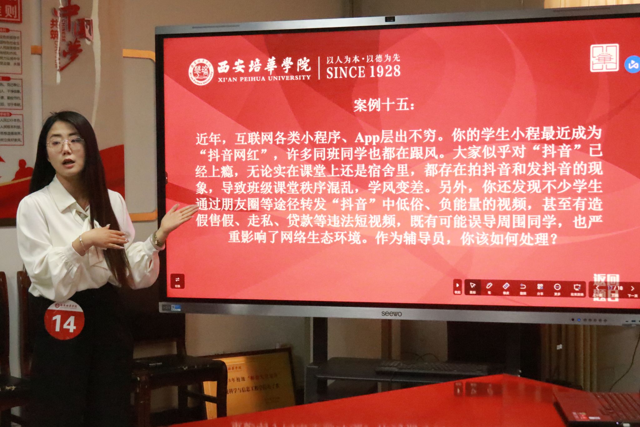 为深入贯彻落实中共中央国务院《关于加强和改进新形势下高校思想政治工作的意见》,教育部《普通高等学校辅导员队伍建设规定》等有关文件的任务要求进一步,加强我院辅导员队伍建设,推进辅导员队伍职业化、专业化建设,提升辅导员专业水平和职业能力素养,充分发挥以赛代训、以赛代练、以赛代培的作用,2024年5月24日智能科学与工程学院举办第八届辅导员素质能力大赛初赛案例分析环节。
