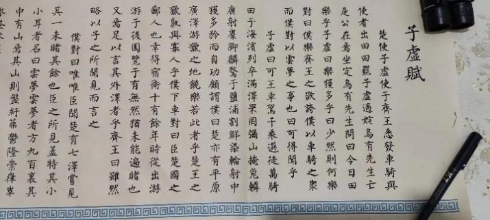 通过对子虚赋的书法练习,我感受到的不仅仅是大汉辞赋的工整华丽和以虚静为君的道家思想和文化,还有练习书法时的心灵宁静,从书法艺术中汲取的精神食粮更加利于我的生活和学习,也是对传统文化的继承和发扬。