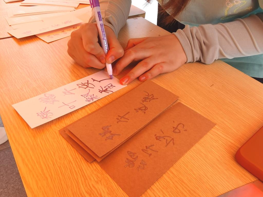 组织同学们自制书签,利用团委分发的卡纸,自己动手设计制作书签。他们制作的一张张书签色彩斑斓,图文结合,画面构思巧妙,颜色搭配合理。每一张书签都凝聚着同学们真诚的心愿,书签上除有精美的图案外,还有读书座右铭、读书格言、读书警句及中华经典诗词等。制作书签增强了学生的实践动手能力,提高了审美意识,体验到了创作的乐趣。