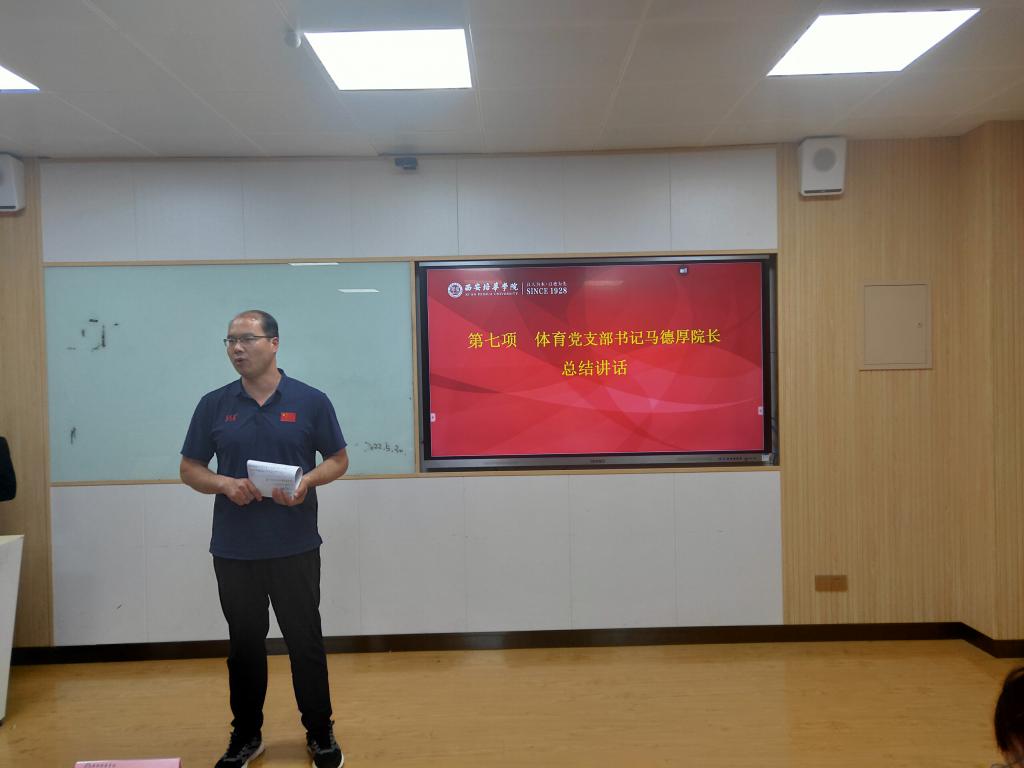 最后体育学院党支部、行政副院长马德厚老师为本次比赛做总结讲话,就班会开展提出几点建议。他指出,主题班会实施过程中需要充分发挥学生的主体作用;主题班会的PPT制作需要图文结合,以图说事;班会过程中辅导员老师与学生的互动需要配合默契,精心设计,避免为了互动而互动;班会气氛的渲染需要巧妙结合语音语调、肢体动作,充分彰显感染力和号召力。